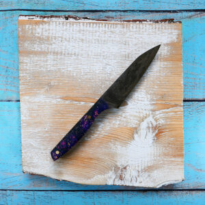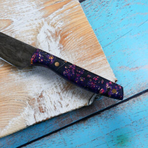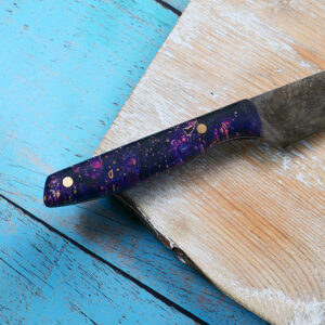 Every knife we make is lovingly crafted from 1084 carbon steel and hardened to 61 HRC. It’s a tough, fine-grain steel that’s great for kitchen knives because it’s easy to sharpen and has a fine edge. The steel has a patina that grows over time and documents the journey of your knife.