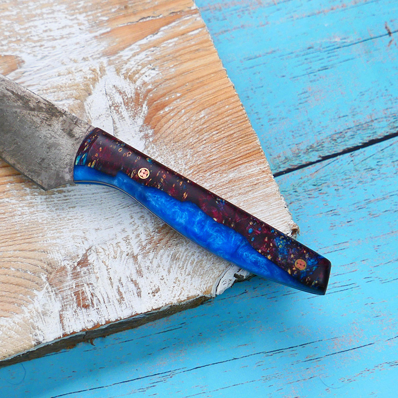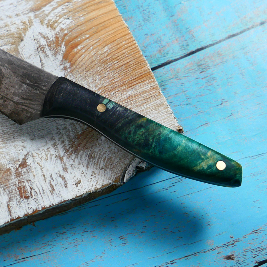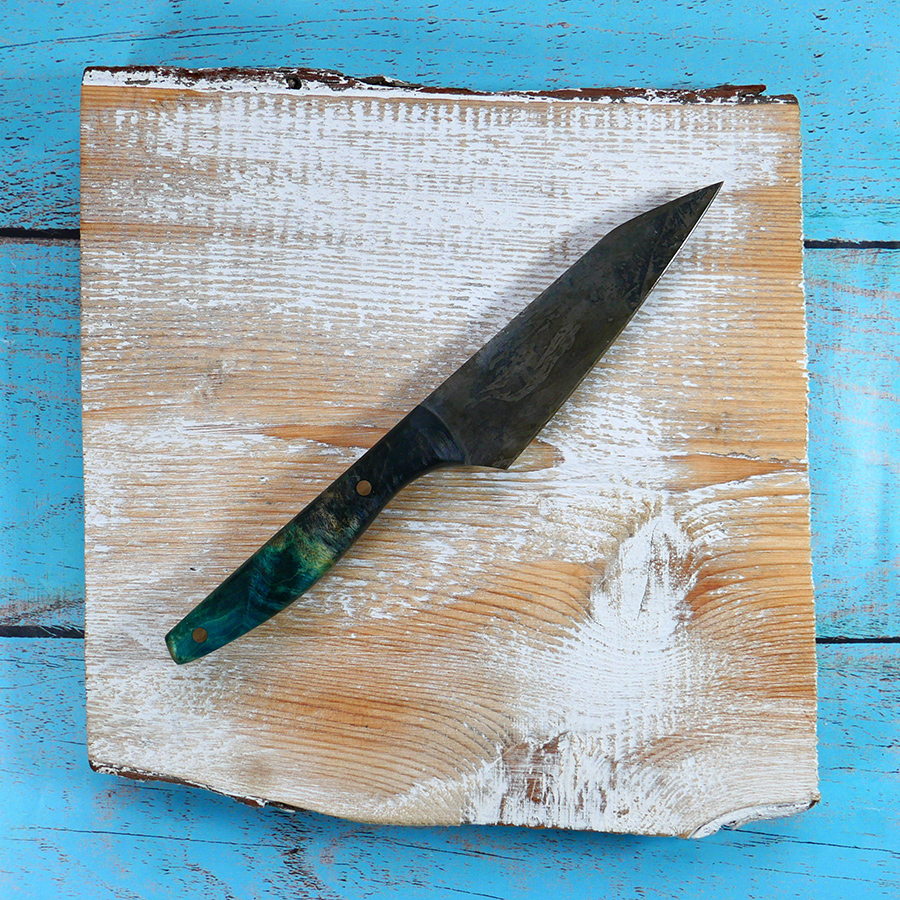 Every knife we make is lovingly crafted from 1084 carbon steel and hardened to 61 HRC. It’s a tough, fine-grain steel that’s great for kitchen knives because it’s easy to sharpen and has a fine edge. The steel has a patina that grows over time and documents the journey of your knife.