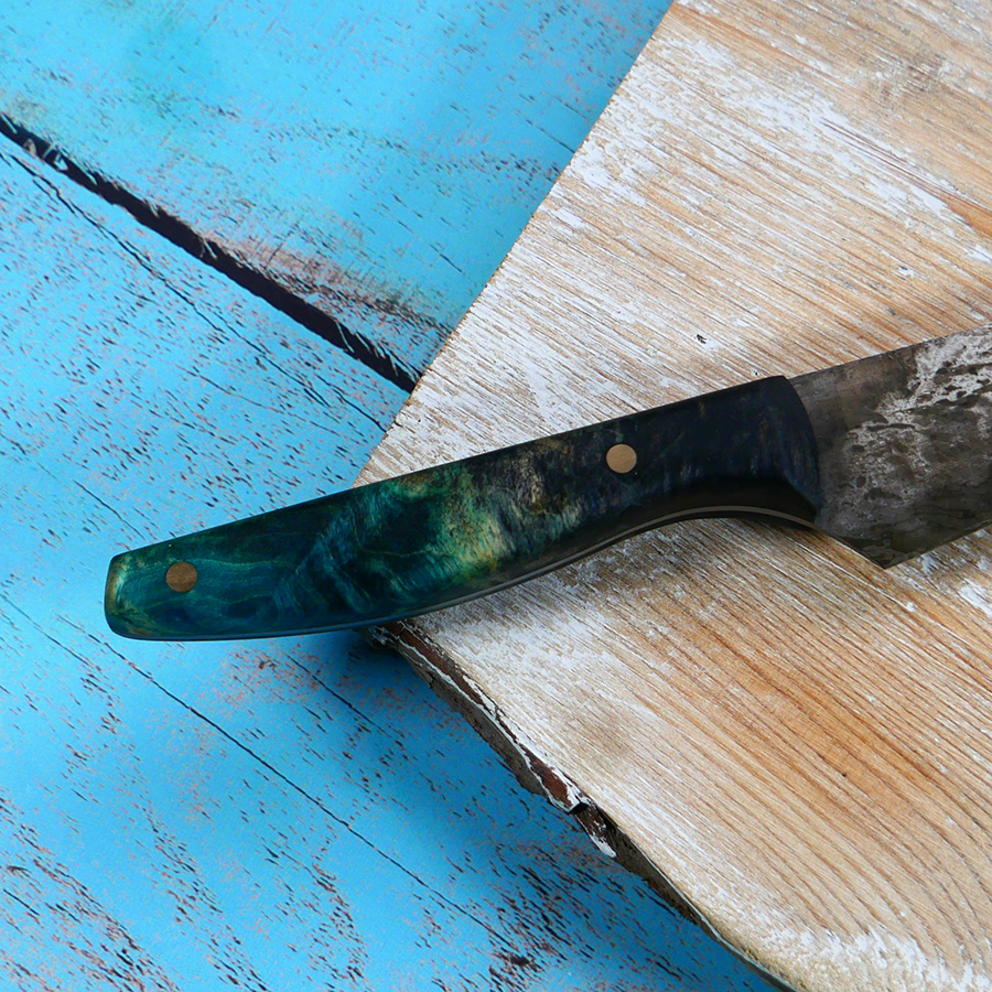 We like to add personality to our knife handles by using a variety of burl and burl woods. We colour them with heat cured coloured stabilising resin which gives them ideal protection in the cooking environment.