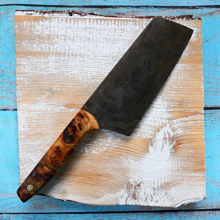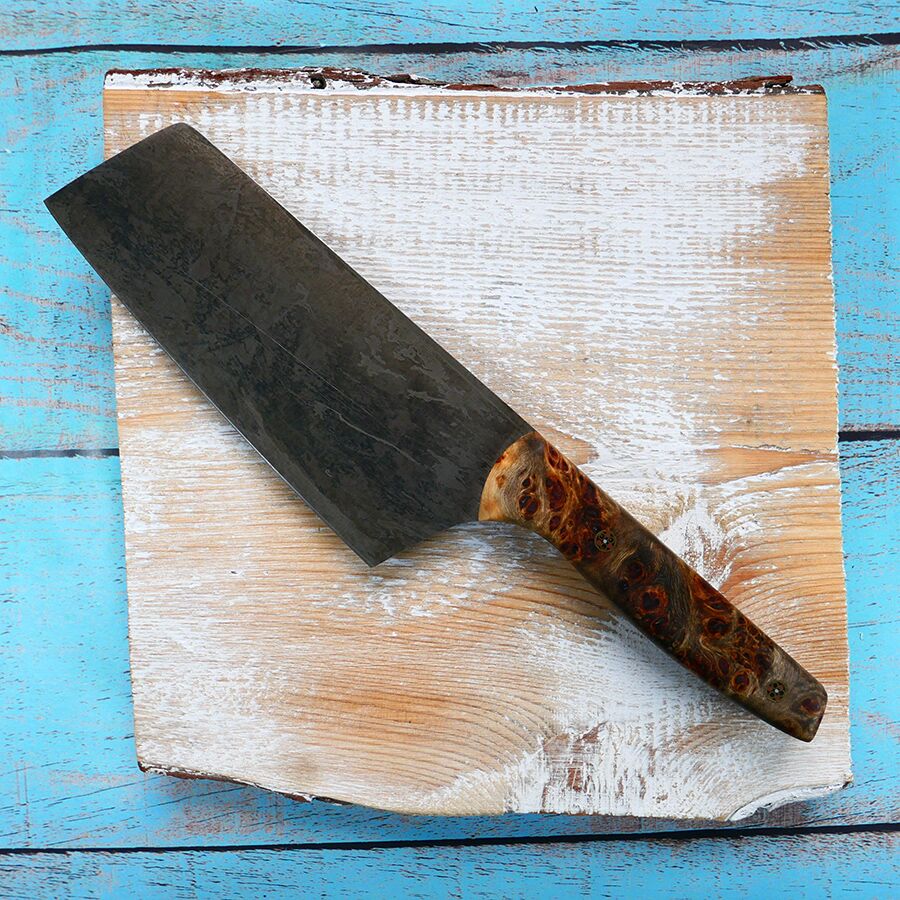 Every knife we make is lovingly crafted from 26c3 carbon steel and hardened to 64 HRC. It’s a tough, fine-grain steel that’s great for kitchen knives because it’s easy to sharpen and has a fine edge. The steel has a patina that grows over time and documents the journey of your knife.