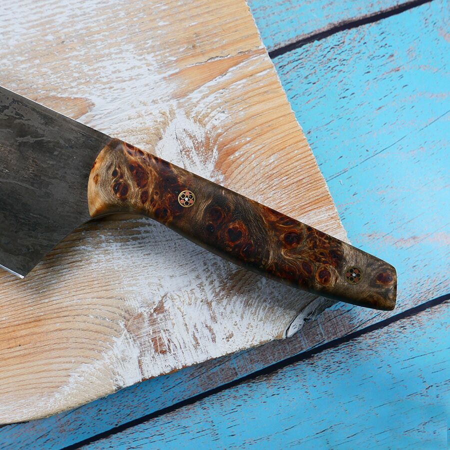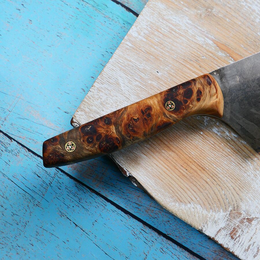We like to add personality to our knife handles by using a variety of burl and burl woods. We colour them with heat cured coloured stabilising resin which gives them ideal protection in the cooking environment.